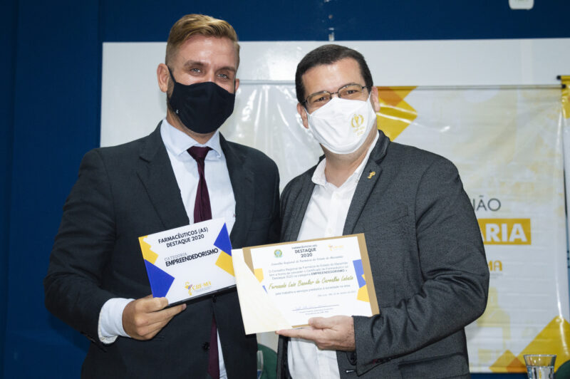A solenidade de entrega da premiação ocorreu durante plenária na tarde do último dia 20 de janeiro, no auditório do Instituto Florence de Ensino Superior – Centro, em São Luís (MA). Em virtude da pandemia do Covid – 19, o protocolo de saúde foi obedecido, com um número restrito de convidados, mas o público em geral acompanhou todo o evento através de transmissão, ao vivo, pelas redes sociais da instituição. O Prêmio Farmacêuticos Destaques, Ano 2020, espelha a dedicação e o empenho de profissionais em onze áreas de atuação, escolhidos através de votação popular, por meio de plataforma on line, que mobilizou toda classe farmacêutica. No detalhe, o diretor secretário do CRF-MA, Dr. Luiz Fernando Ramos Ferreira junto ao Dr. Fernando Luís Bacelar de Carvalho Lobato, vencedor da Categoria Empreendedorismo.