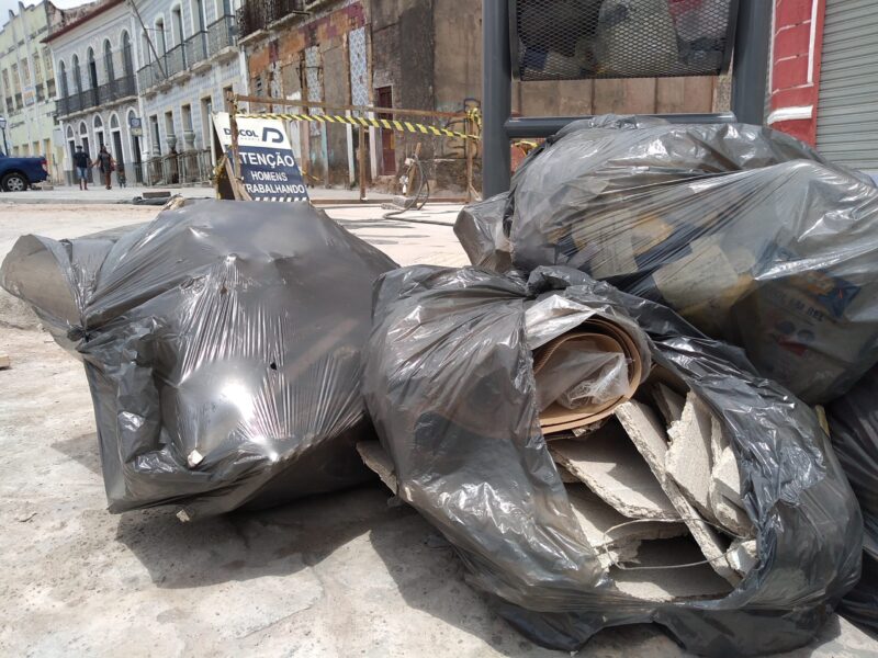 Sacos de lixo armazenam pedras e restos de materiais para retirada – Foto: Gutemberg Bogéa