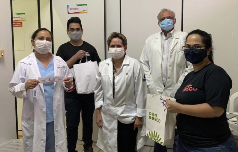 Os professores do Colégio Dom Bosco Jhon Quinaya e Ramilla Rocha entregando a doação de descansa – orelhas aos profissionais do Socorrão II: Roberta Campos, Dorinei Câmara e Aliomar Carvalho.