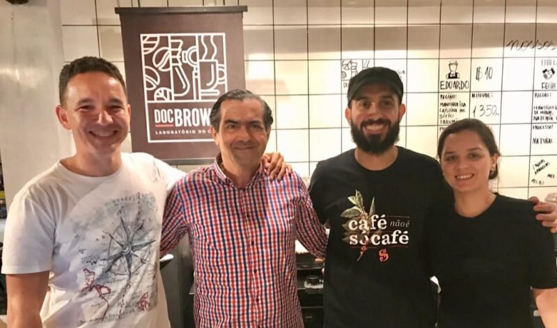 REGISTRO da visita o engenheiro agrônomo e palestrante Luiz Thadeu Nunes e Silva ao novo point do café, o Doc Brown, Laboratório de Café, na Cohama, comandado pelos jovens empresários Thiago Gleria e Jordana Cardoso. Grande apreciador e colecionador de café, Luiz Thadeu foi conhecer o local a convite do travel influencer José Panda Jr.