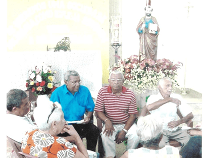 Em 27.6.2007, com os primos mais velhos, todos netos de D. Marcela, a primeira zeladora da original Capela de São Pedro, Isabel (Bela), Gervásio e João Batista dos Santos, Herbert de Jesus Santos, ouvindo o secular pescador aposentado Zé de Zuleide, registrou a origem da Festa de São Pedro – Foto: Lio Ribeiro