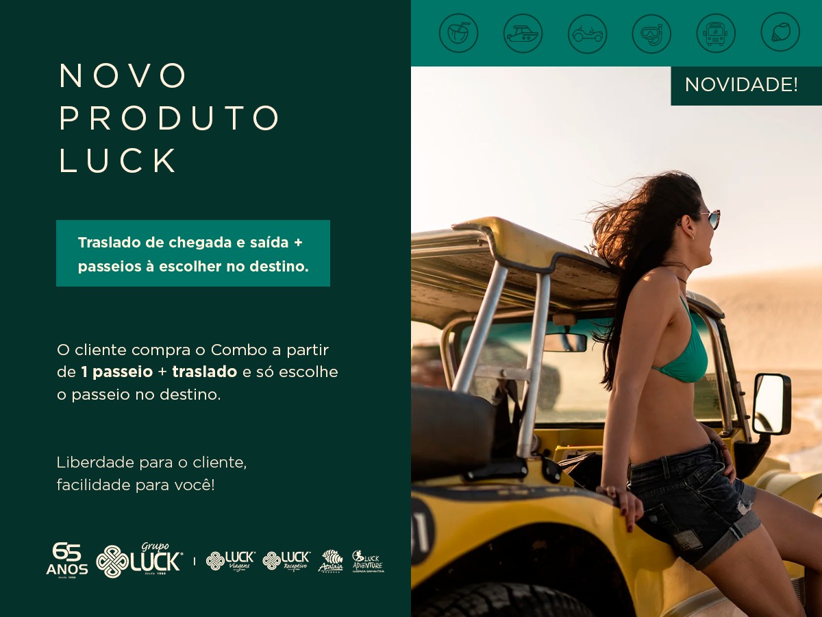 O novo serviço inclui traslado de chegada e saída e a possibilidade de escolher entre opções de passeios somente após a chegada, diretamente no local. O Pacote Flexível já está disponível em todas as bases onde a Luck atua: Recife, Salvador, Maceió, Natal, Aracaju, João Pessoa e Fernando de Noronha, oferecendo ao mercado uma solução versátil e que se adapta a diferentes perfis de viajantes.