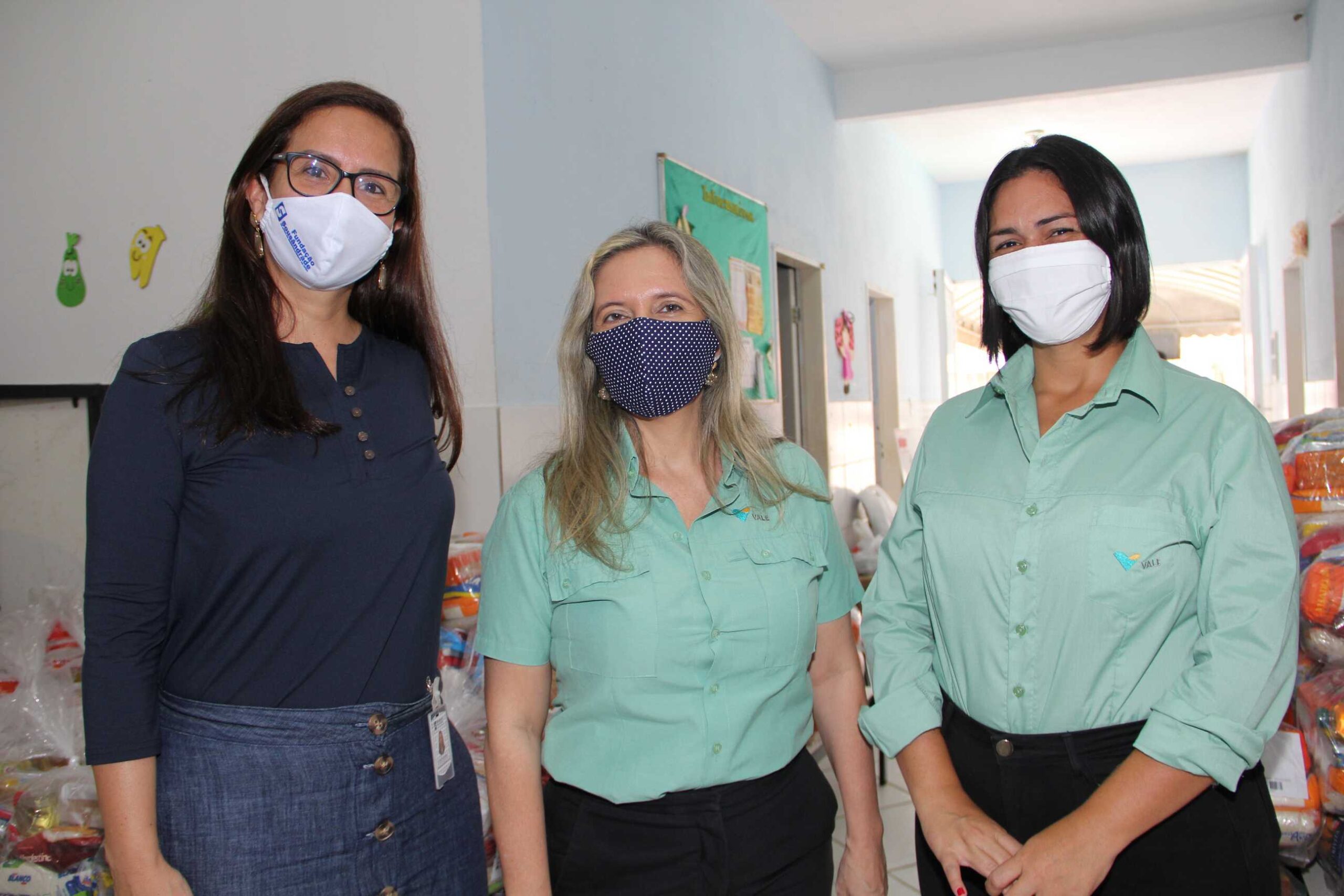 Liliane Moreira (Fundação Souzândrade) com Vanessa Tavares e Elida Brandão (Vale), apoiadoras do projeto Devotos de São João, na entrega das doações à creche Deus Criou.