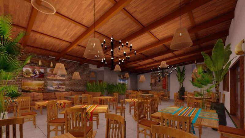 O ambiente do restaurante vai remeter a uma fazenda de tempos passados, com amplo uso de materiais naturais. Inclusive, toda a madeira usada foi reaproveitada das pontes retiradas da Estrada do 21, rodovia que liga Bonito ao Pantanal.