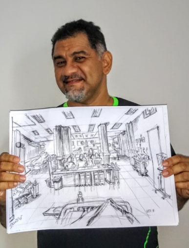 LEGENDA – O paciente do SLZ e artista Marcos Dominici, que fez esse desenho e presenteou o Hospital em agradecimento às equipes da UTI pelo tratamento eficiente e humanizado que recebeu.