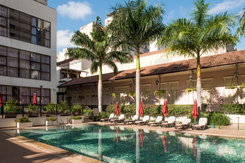 Para chegar lá, na última sexta-feira, 27, à noite, atravessamos um universo de badalação entre bares e botecos, calçadas cheias de gente, barracas próximas aos Arcos da Lapa, e o barulho vigente que preenche todos os espaços daquela agitação urbana, até nos depararmos com uma fachada imponente. Logo senti, ali estava o Vila Galé. Ao entrar, tive uma agradável sensação de leveza e bem-estar confirmando a boa impressão; um vão de pé direito duas vezes maior que a medida padrão e paredes cor-de-rosa, típicas das construções de época, e móveis de madeira completavam a plenitude daquele ambiente clássico. Suspirei…Caminhei pelo corredor que dá acesso à torre de apartamentos, e avistei uma piscina convidativa fazendo o elo entre o antigo e o contemporâneo, numa transição perfeita. O hotel divide-se em duas alas: a Ala Collection, que integra as suítes que mantêm o charme palaciano, e a Ala Lapa Towers, uma torre de 13 andares que integra os demais alojamentos.